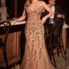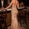 Perfeito para quem deseja brilhar, esse vestido de festa combina sensualidade, elegância e sofisticação na medida certa. O modelo conta com um corpete estruturado e justo ao corpo, ricamente bordado com pedrarias em tons dourados, rosé e acobreados, que criam um desenho orgânico e luxuoso sobre o tule nude. O decote profundo com transparência central valoriza o colo com ousadia e bom gosto, enquanto a estrutura sem mangas oferecem leveza e charme ao visual.